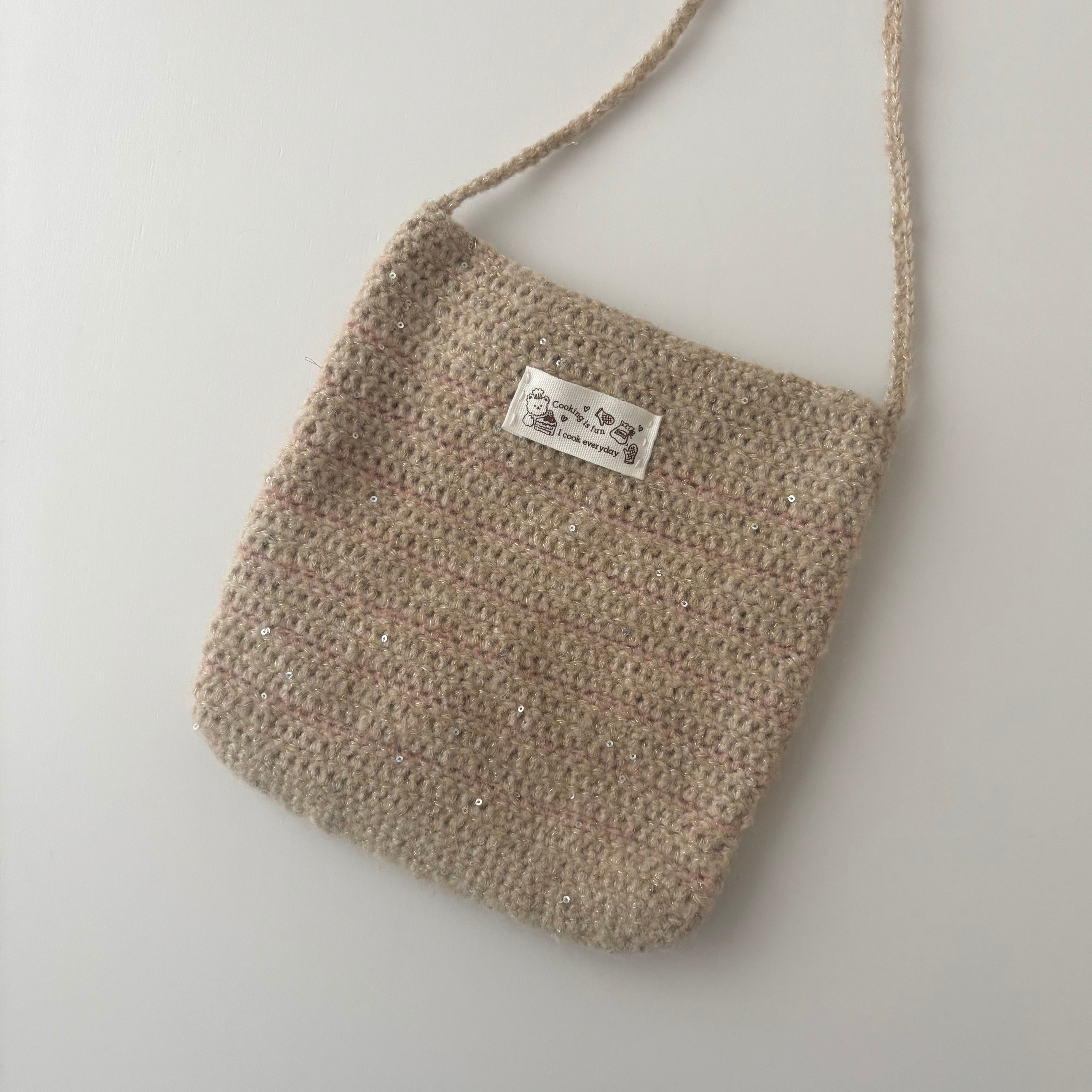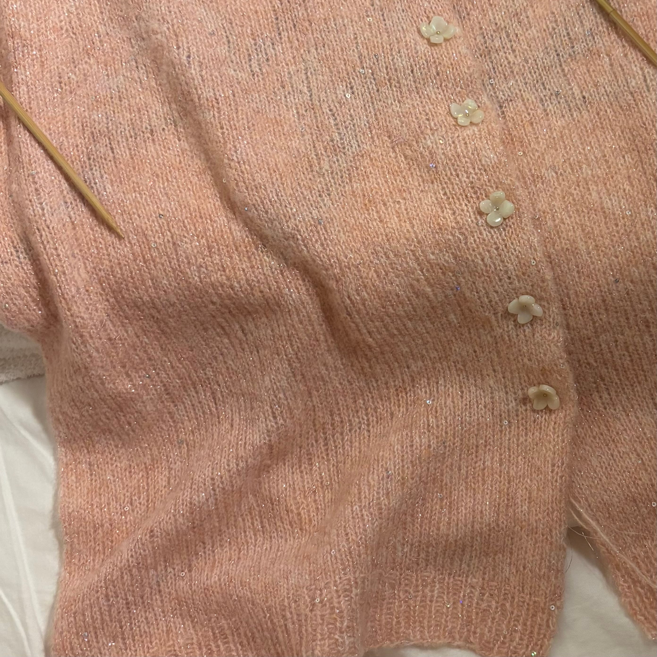小さめのスパンコールがほどよく入っていて、さりげなくオシャレに仕上がる毛糸。やわらかい手ざわりで、編みやすく心地よさも楽しめます。